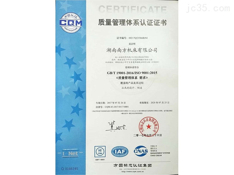 国产XxXX質量管理體系認證證書-湖南南方機床有限公司